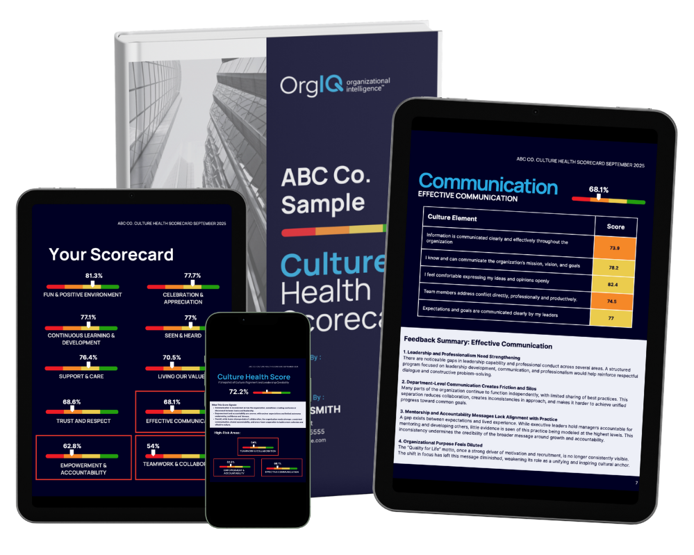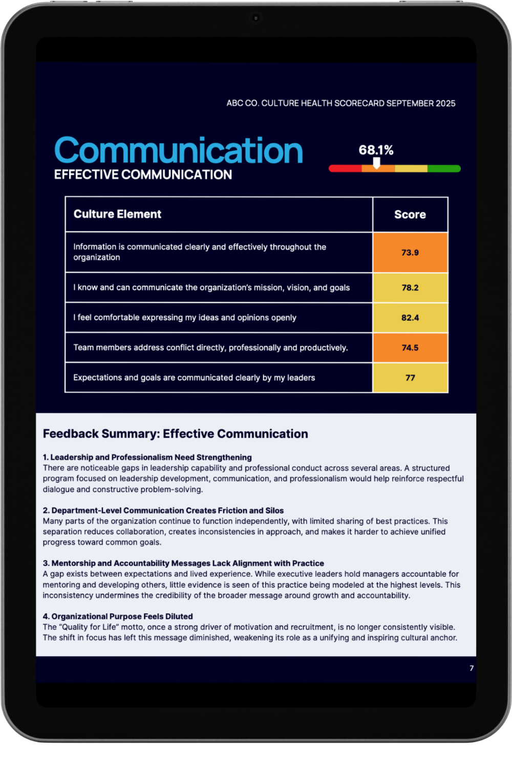 The Culture Health Scorecard™ gives you the diagnostic power organizations trust and the clarity leaders rely on to make meaningful decisions.